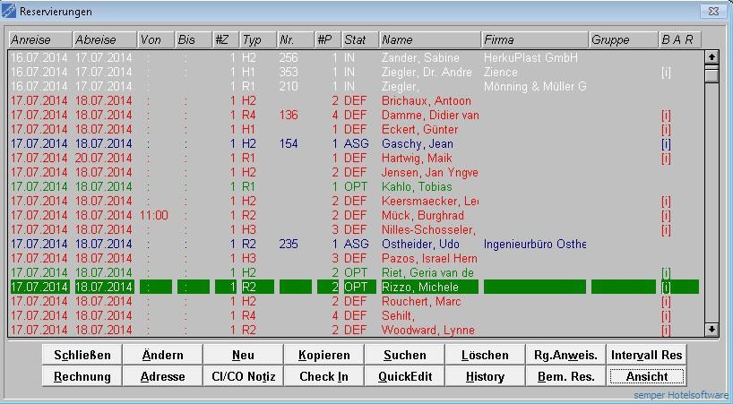 In der Reservierungsgesamtliste werden alle Reservierungen sortiert nach Anreise angezeigt. Eine komfortable Suchfunktion ermöglicht eine übersichtliche Anzeige nach allen anderen möglichen Reservierungskriterien. Die diversen Reservierungsstati werden in den entsprechenden Farben angezeigt.